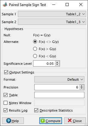 This dialog is activated by selecting the Paired Sample Sign Test... command from the Statistics -> Nonparametric Tests -> menu. It can be used in order to test for consistent differences between pairs of observations. The Wikipedia article on the sign test makes for excellent reading on this topic.