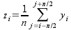 The Analysis -> Smooth -> Moving Window Average... command opens this dialog with the moving window average method already selected. The formula used to smooth the curve defined by the points yi=f(xi) is in this case: