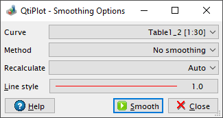 For all methods, this dialog allows specification of the line style used to draw the smoothed curved. A new hidden table is created in order to store the output data points xi, zi of the smoothed curve. If the selected method is No smoothing, the output of the smoothing filter is a curve identical with the input data curve.