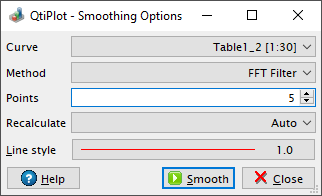 The Analysis -> Smooth -> FFT Filter... command opens this dialog with the FFT Filter method already selected. This method performs a smoothing of the selected curve using a Low Pass technique: the number of Points specified is used to calculate a cut-off frequency.