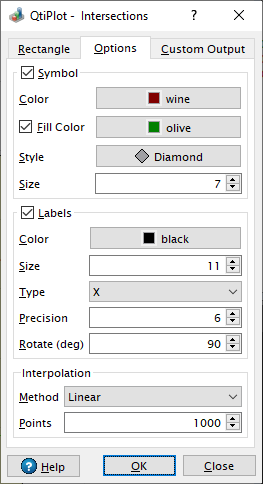 The controls in the Symbol group box of this tab can be used in order to define the style, size and and color of the data symbols used to visualize the intersections between curves.
