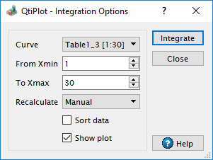 By checking the Show plot option a new graph window will be created containing a plot of the integrated curve, the data for which is stored in a new (hidden) table. QtiPlot stores the integration operation into this output graph window if the Recalculate option is other than No. By setting this option to Auto any modification of the input data will trigger a recalculation of the value of the integral.