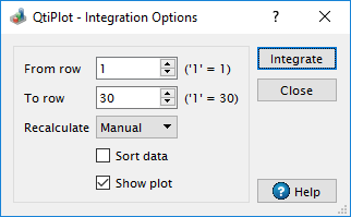 This dialog box is opened when you select the Integrate... command from the Analysis menu. The dialog displays a different set of controls depending if you are integrating data from a table or from a plot curve.