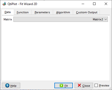 The data set to be fitted, as well as the 2D fit model can be visualized in a 3D plot panel embedded in this dialog. This 3D plot can be shown/hidden with the help of the Preview check box.