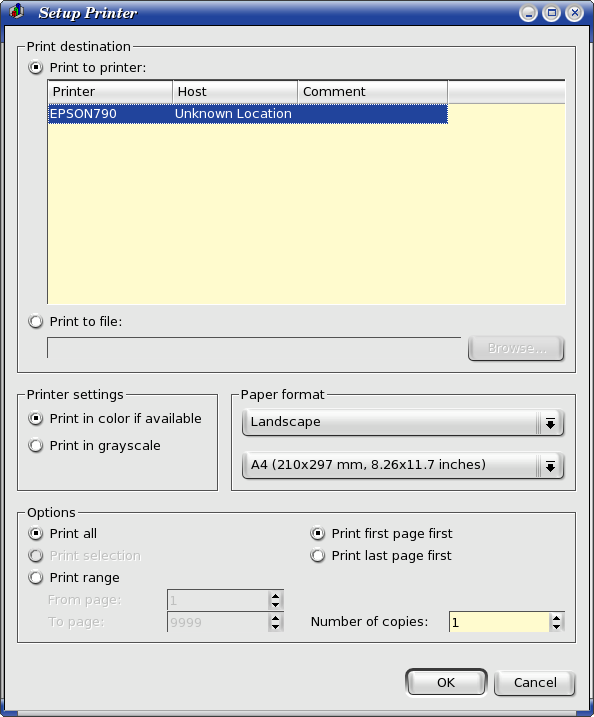 This dialog box is opened by the Print command from the File menu or by entering the Ctrl-P key. It is used to print the selected window (plot or table) and its exact appearance will depend both upon your operating system and the printers that you have available. The following screenshot shows the dialog on a Linux system with one printer that uses the KDE window manager.