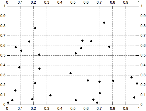 In order to understand how the frequency count process works please consider the following example: the table to be converted has two columns (X and Y) both containing random values between 0 and 1. We decide to create a new matrix with 10 rows and 10 columns, that is 100 bins. If we represent the input data using a scatter plot we get the graph bellow, where the scale divisions were changed to have a 0.1 step for both axes. In this graph, each square of the plot grid represents a 2D bin. QtiPlot counts the number of scatter points in each square and stores these values in the new matrix.