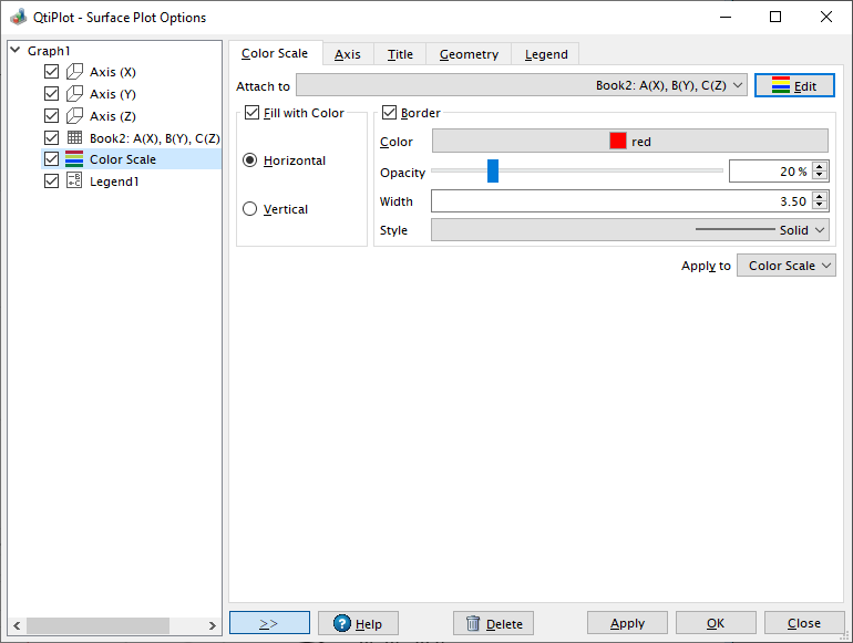 The Color Scale tab is used to customize the appearance (color filling and border) of a 3D color scale object.