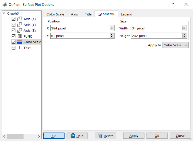 The Geometry tab is used to define the Position and Size of the color bar of a 3D color scale object, using pixel coordinates.