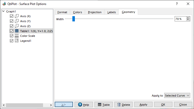 In the case of 3D curves having the plot style set to Ribbon, this tab can be used in order to customize the width of the ribbon. The width is calculated in percentages of the Y axis length.