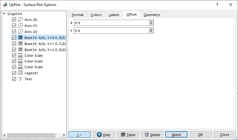 The Offset tab is only visible in the case of 3D curves having the plot style set to Line + Symbols or Bars. It allows to add an offset allong X and Y axes for each data point symbol.