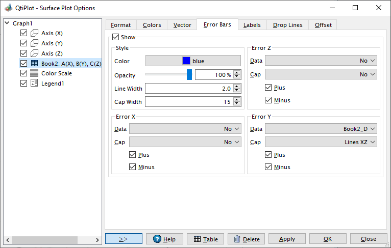 The Error X and Error Y group boxes are only available for line and symbols 3D plots.