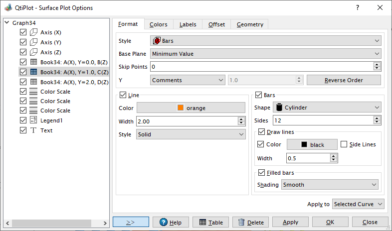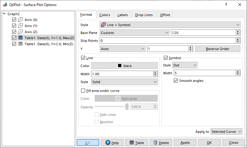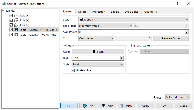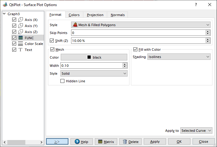 The Format tab allows modification of the properties of the 3D curve/surface, like the color and linewidth of the mesh or the style of the data symbols.