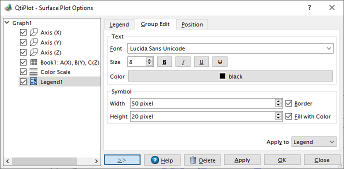 The Group Edit tab is used to enable/disable the display of a plot legend and its appearance.