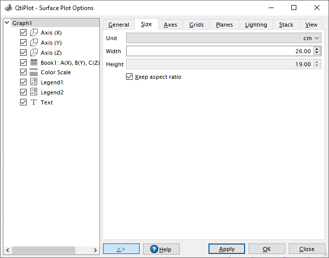 Using the Size tab it is possible to precisely define the size of the plot area in a 3D graph window. From the provided Width, Height and Unit values, QtiPlot calculates the size in pixels and resizes the window so that the plot area has the values you specified.