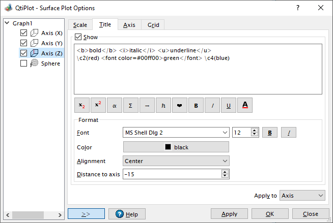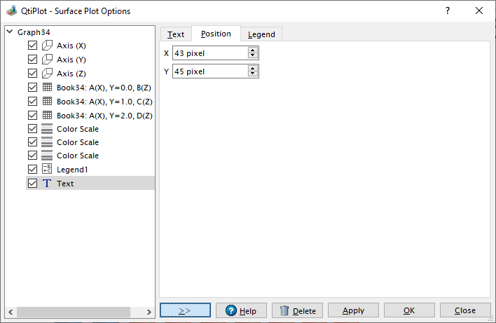 The push buttons bellow the text input box allow for easy insertion of subscripts, superscripts, greek characters, special symbols, etc... in your text. The syntax for the formatting of the text is identical to that described for texts in 2D plots, see the detailed explanations in the Text options dialog.