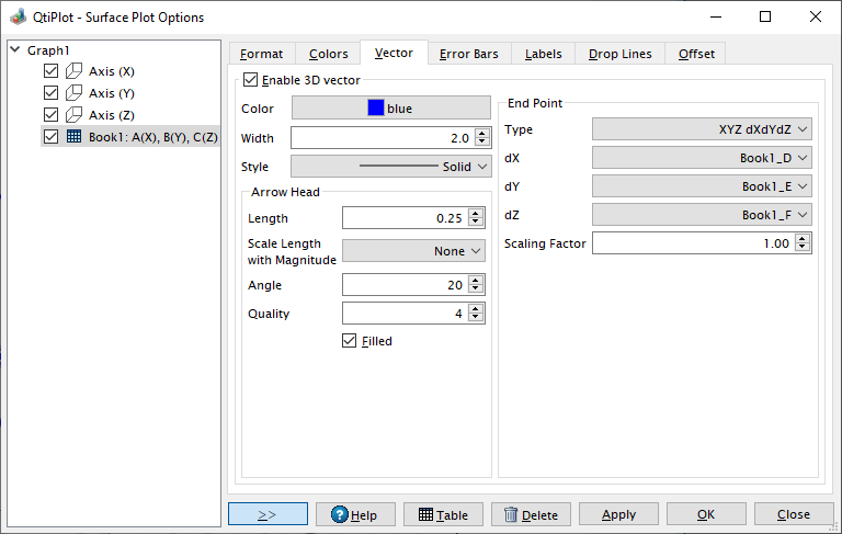 The Vector tab is used to enable/disable the display of 3D vectors and to customise their appearance.