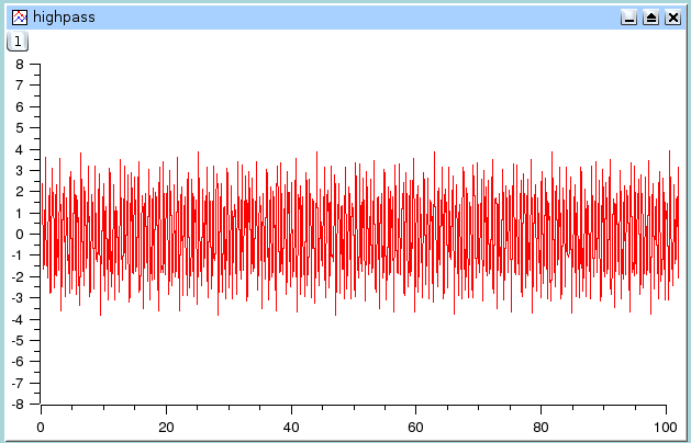 This filter cuts low frequencies from a signal. You just have to select the cut-off frequency of the filter. Let us assume that we want to keep the frequencies above 1 Hz, we will obtain: