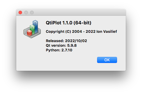 Opens a message box with information about the current QtiPlot version and architecture (32-bit or 64-bit), its release date and the Qt and Python versions used to build QtiPlot.