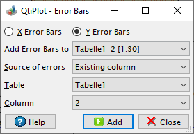 Note that clicking on the "Close" button will not add any error bars to the plot. You must set up the parameters for the error bars first and then click on the "Add" button. If you click on "Close" without clicking "Add", there will be no error bars drawn.