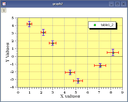 This command adds a new column to the table associated with the plot and fills it with result of calculating V*E/100 for each row in the table, where V is the plotted value and E is the selected percentage. This column is then used to plot the error bars in exactly the same manner as in the previous case. The new column can subsequently be edited like any other column. Any changes will be reflected in the size of the corresponding error bars.