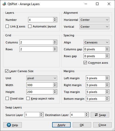 You can specify the number of rows and columns that define a grid of plots. With the default settings, QtiPlot computes the size of the layers in the grid from the size of the graph window. If you check the Layer Canvas Size option, you can set the size of the drawing area for the layers. QtiPlot will then modify the size of the graph window to accommodate them. When the Fixed size box is checked, the size of the layers will be kept unchanged when you manually resize the graph window.