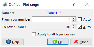 This dialog may be used in order to change the visible data range for a 2D plot curve. By default, the Auto boxes are checked and QtiPlot displays the start row number (1) and the end row number corresponding to the full data range of the curve. In order to edit these values the Auto boxes must be unchecked first.