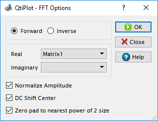 If the dimensions of the input matrix are not powers of 2, you have the option to resize it for a more efficient FFT, by checking the box Zero-pad to nearest power of 2 size. The new dimensions are calculated to be the closest powers of 2 from the initial dimensions of the matrix and the extra data values used for the FFT are set to zero.