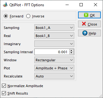 When performing an FFT on a table, you must select the sampling column (X-values) and one (for simple real values) or two (for complex values) columns of Y-values. Complex numbers have the real part of the Y-values in the first column and the imaginary part of the Y-values in the second column. If Y-values are simple reals, you don't have to select a column for the imaginary part. You can leave the combo box for the second column empty in this case.